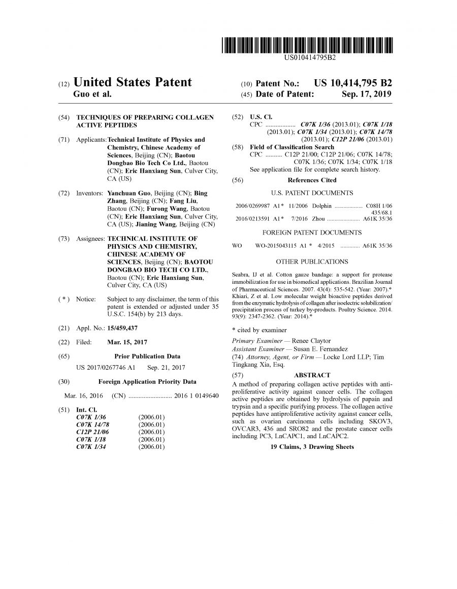 專(zhuān)利名稱(chēng):《TECHNIQUES OF PREPARING COLLAGEN ACTIVE PEPTIDES》(膠原蛋白活性肽制備技術(shù))