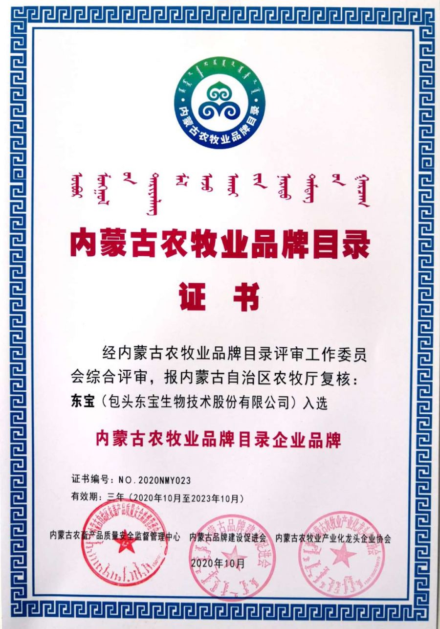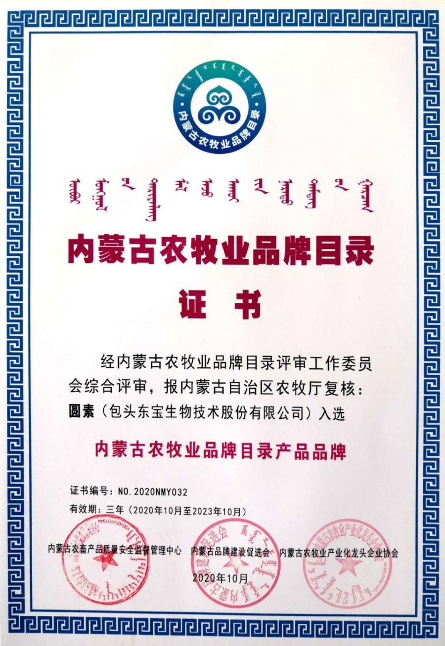 近日,內蒙古農牧業(yè)品牌目錄發(fā)布會(huì )在內蒙古國際會(huì )展中心成功舉行,自治區農牧廳和有關(guān)部門(mén)領(lǐng)導、組織實(shí)施單位負責人及品牌目錄企業(yè)代表近100人參加了發(fā)布會(huì )?,F場(chǎng)發(fā)布了內蒙古農牧業(yè)品牌目錄名單,東寶生物的“東寶”和“圓素”成功入選,作為內蒙古農牧業(yè)品牌代表并頒發(fā)了證書(shū)。