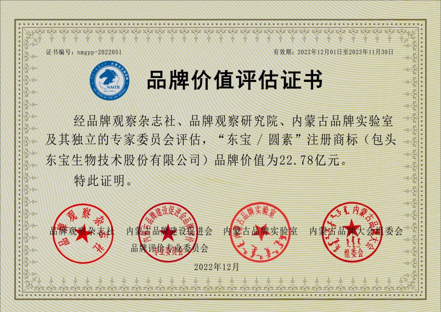 2023年1月,由內蒙古品牌建設促進(jìn)會(huì )主辦,內蒙古品牌大會(huì )組委會(huì )、內蒙古品牌評價(jià)專(zhuān)業(yè)委員會(huì )、內蒙古知名品牌認定委員會(huì )承辦的“2022年度內蒙古品牌價(jià)值評價(jià)信息宣介發(fā)布會(huì )”在呼和浩特隆重召開(kāi)。發(fā)布會(huì )上不僅公布了東寶生物榮獲2022年度“內蒙古百強品牌企業(yè)”、“內蒙古品牌建設標桿企業(yè)”等稱(chēng)號,還對“東寶/圓素”進(jìn)行了品牌價(jià)值評估認證。